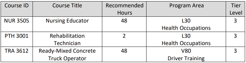 The State Board has approved the following Workforce Continuing Education courses for